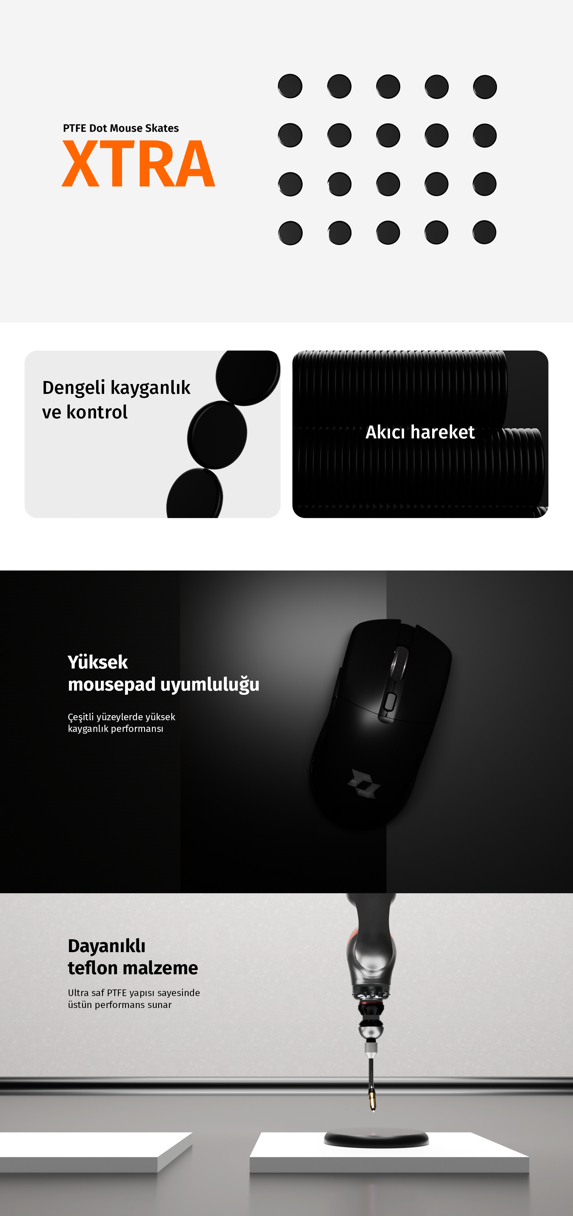 PTFE Dot Skate’ler, diğer malzemelerden üretilen skate’lere kıyasla daha geniş bir kullanım alanına sahiptir. Kumaş, hibrit ve cam mouse pad’lerle kullanıldığında kayganlık performansını artırır. Maksimum performans için oyunculara özel üretilmiş mouse pad’lerle kullanılması önerilir.