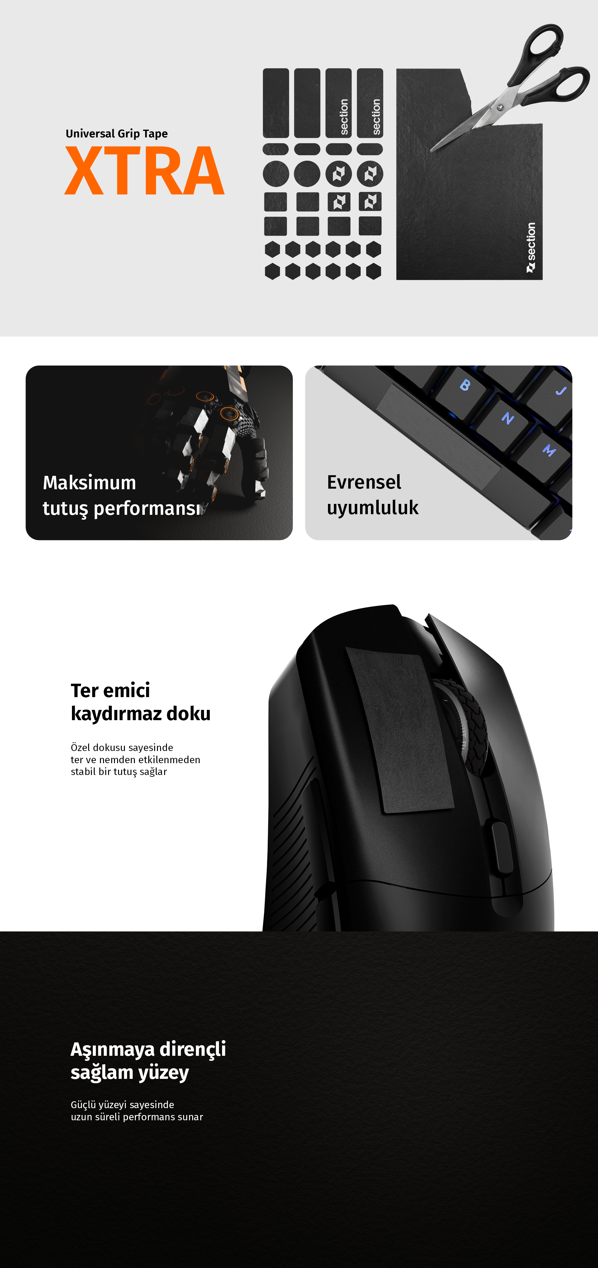 Grip tape, mouse kullanımı sırasında daha iyi kavrama sağlamak amacıyla kullanılan özel bir yüzey kaplamasıdır. Terlemeyi azaltır, kaymayı önler ve özellikle uzun süreli kullanımlarda kontrolü artırır. Section Grip Tape’lerde bulunan suyu absorbe etme özelliği sayesinde daha kuru ve konforlu bir kullanım sunar.